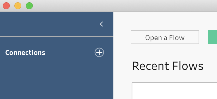 When opening Tableau Prep Builder you will find the 'Home' screen very similar to Tableau Desktop. To make any data connection, you will need to click on the '+' next to the word Connections.
