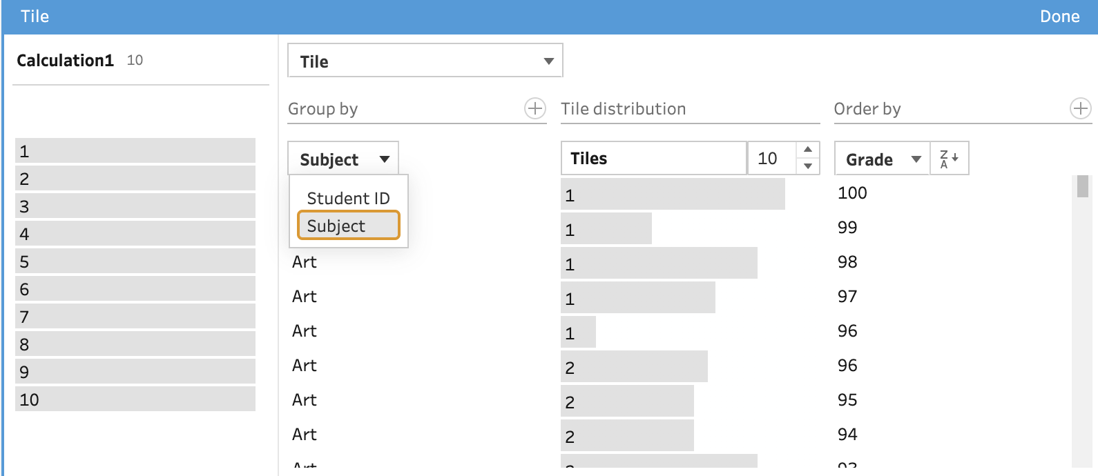 When selecting Subject to group the tiles by, the records associated to each subject will be split into 10 even tiles (as that is what we set the number of tiles to earlier). This allows us to determine what grade is needed by the students to be in the first tile (i.e. the top decile). For example, you would need to score 97 to be in the top decile in English but 96 to be in the top decile in Art.