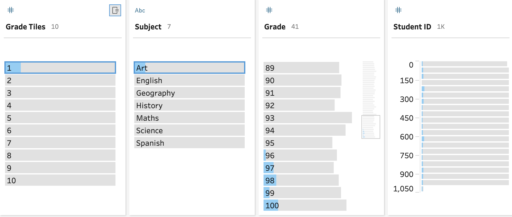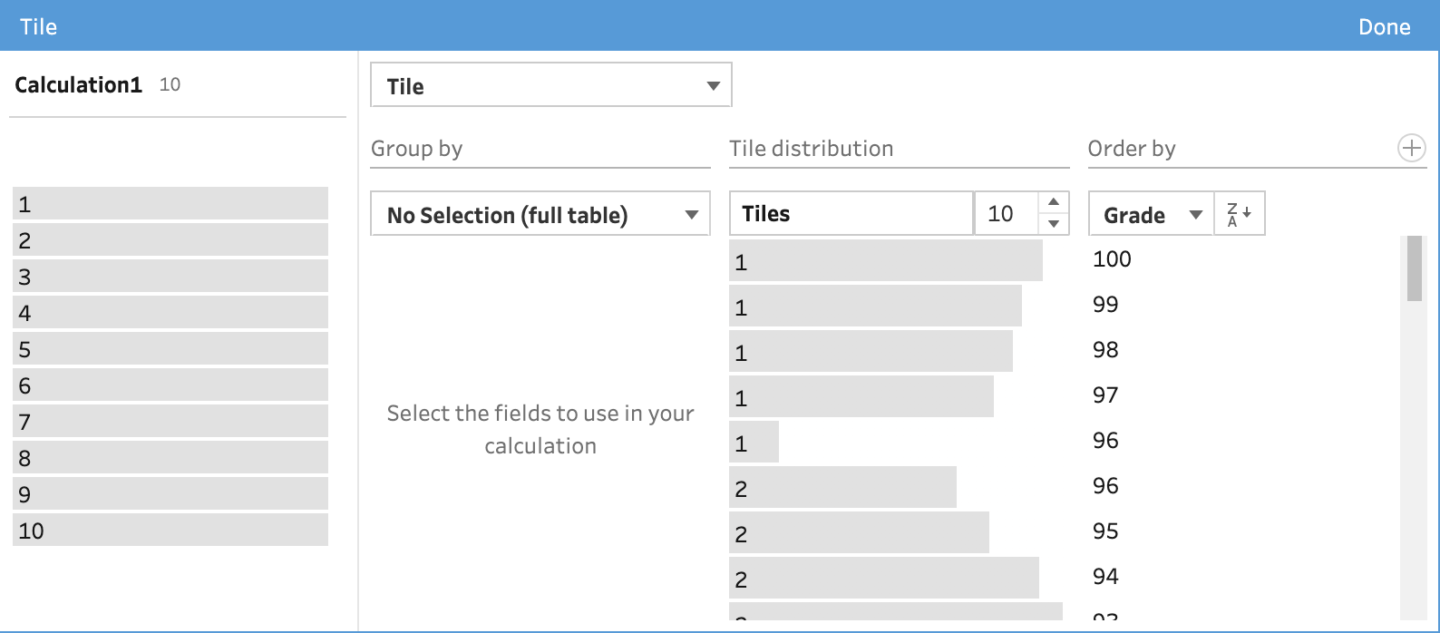 In the example above, you can see that grades of 97 to 100 all fall into the first tile but 96 falls into both the first and second tile. The length of the grey bar to the left of each value shown in the Order By section shows how many records are captured in that tile for that value.