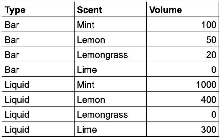 When apply this technique to the dataset with Nulls, the values returned for Bars and Liquid is 56.6 and 566.6 respectively. However, applying the same technique to the the table containing zeros gives results of 42.5 for Bars and 425 for Liquid product types.