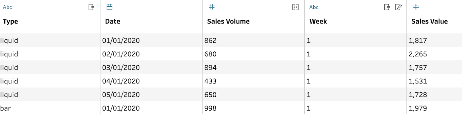 Let's use Preppin' Data 2020 Week 8 challenge to show the effect of this. This challenge starts with a Wildcard Union but results in two columns for the Volumes.