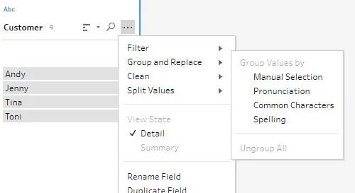 In Tableau Prep, the grouping functions have gone beyond the Desktop version of the tool and can assist much faster clean-up of messy data sets. Grouping isn't just by manual selection as it is in Desktop but there are three alternative modes when working with strings:
